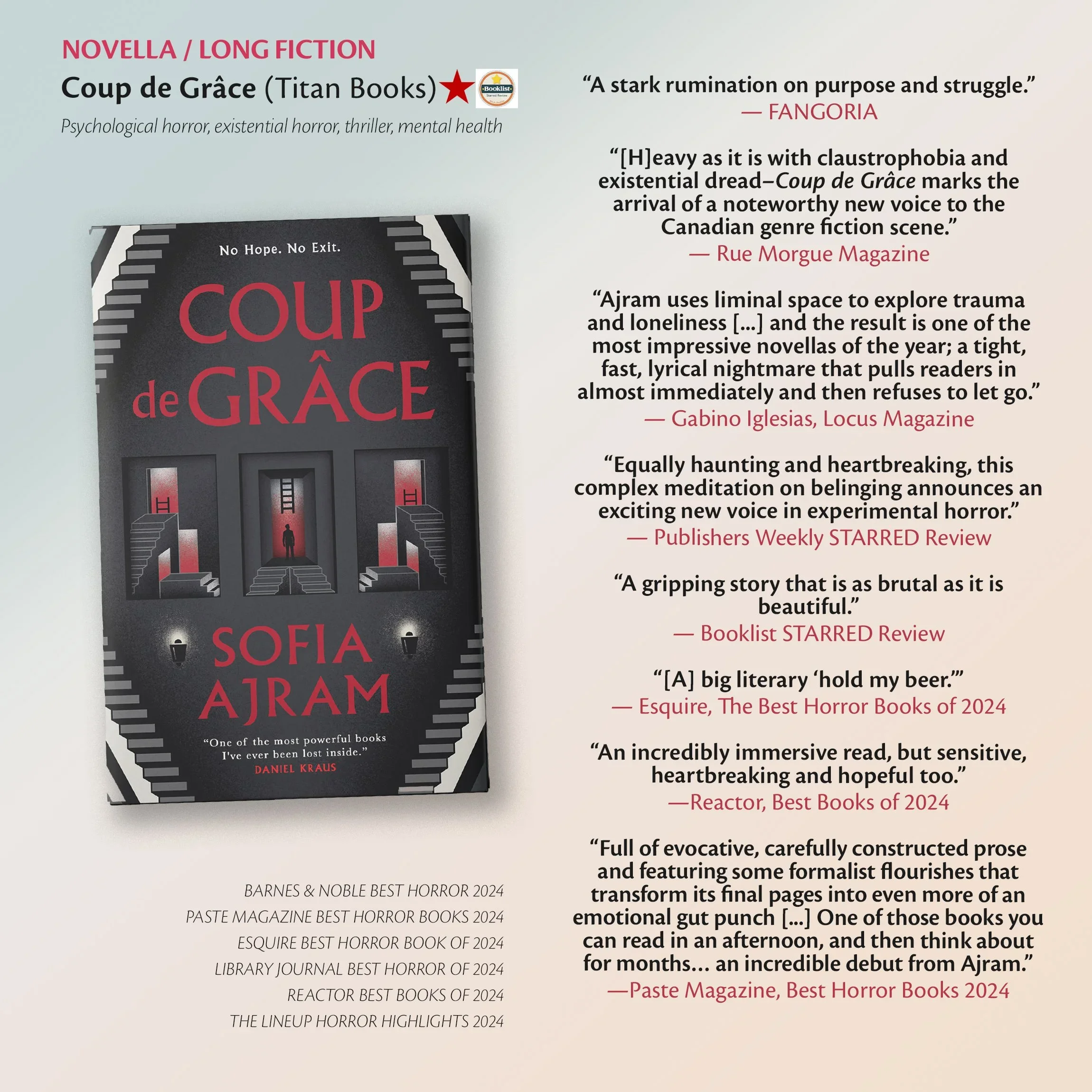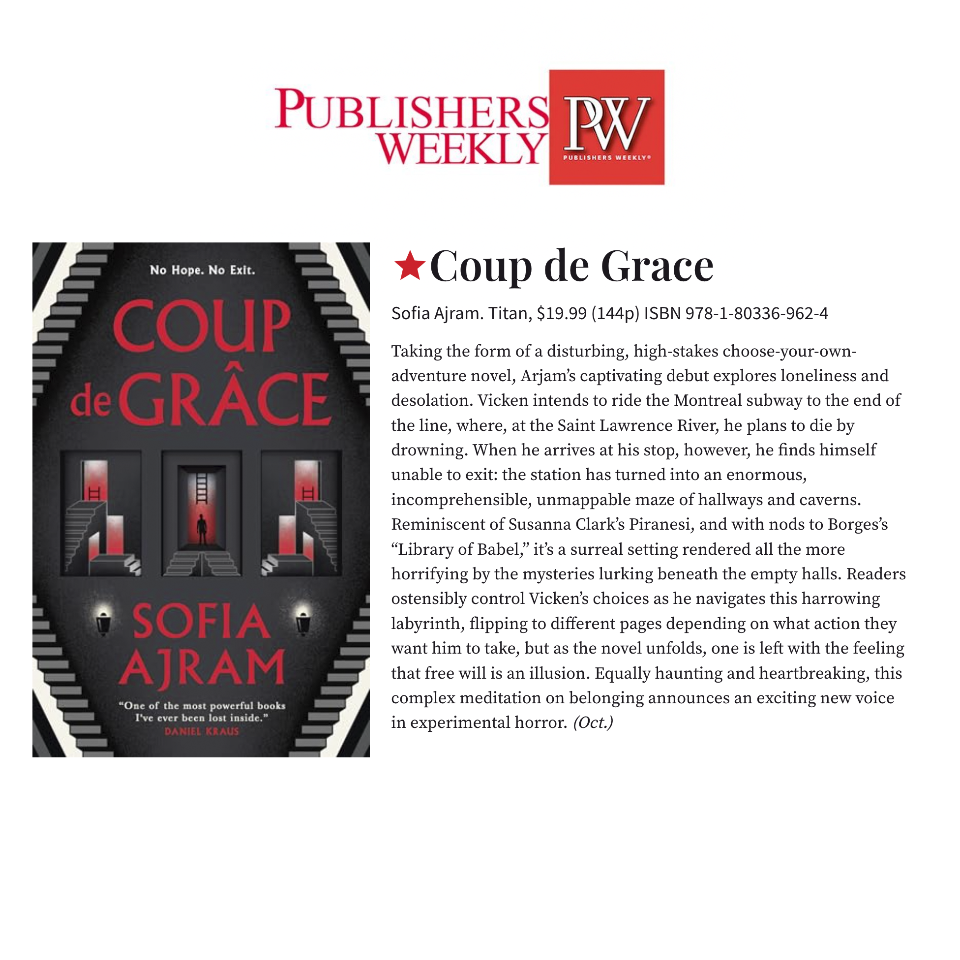 “It’s become a rare joy to read something in mainstream genre fiction that values opaque dread, atmosphere, and WTF-ness just as much as standard story beats. Sofia Ajram has that kind of gift, with the eloquent prose and forked tongue to match. With irresistible, despairing beauty, Coup de Grâce invites you to get hopelessly lost within the labyrinthine mind of a formidable new force in horror.”